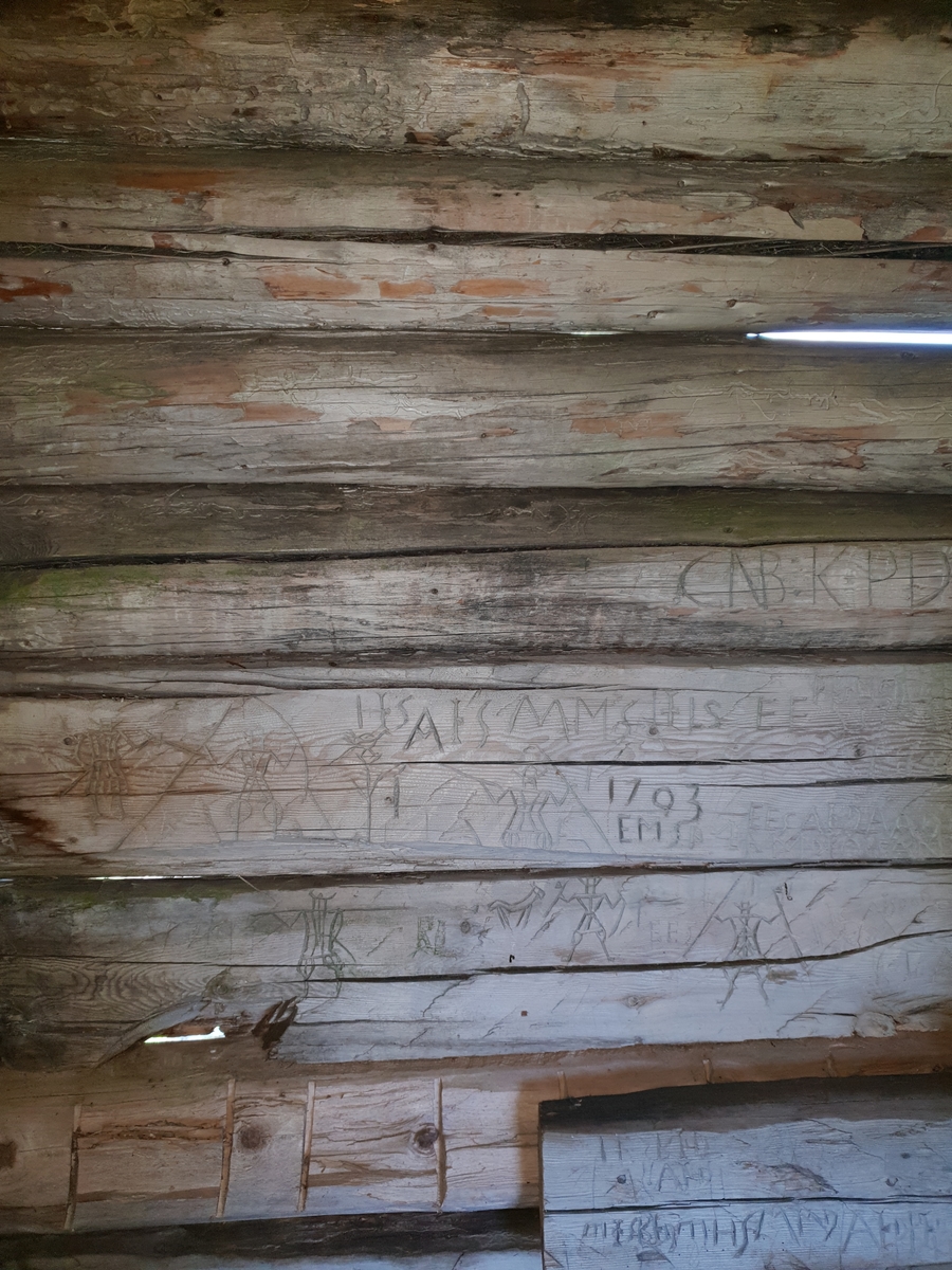 Timmervägg, ristningar inomhus, Ärteråsen, Ore, 2018.