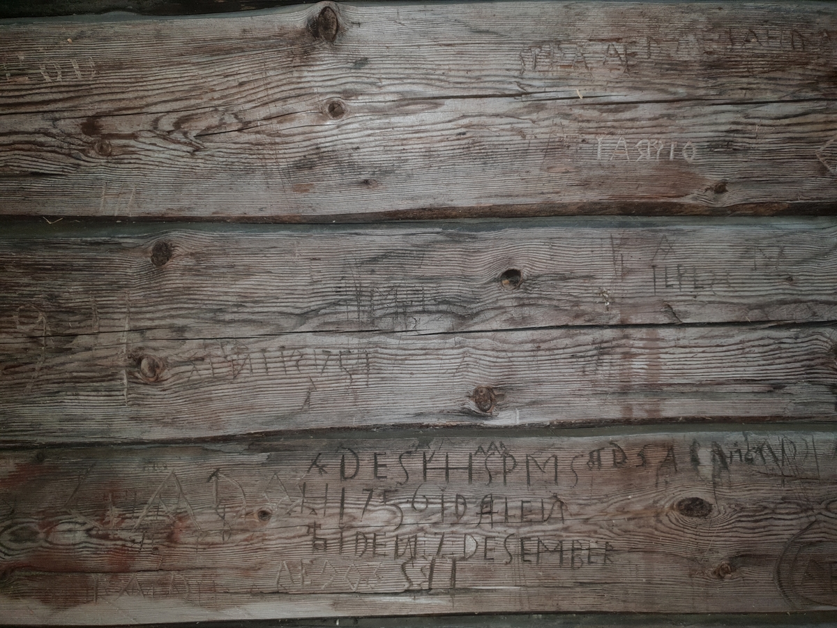 Timmervägg med ristningar, inomhus, Ärteråsen, Ore, 2018.