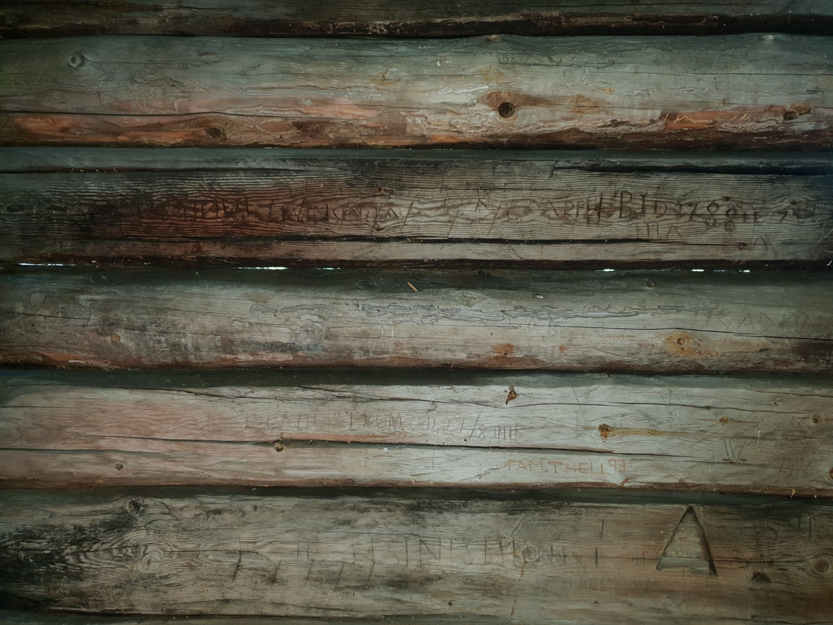 Timmervägg med ristningar, inomhus, Ärteråsen, Ore, 2018.