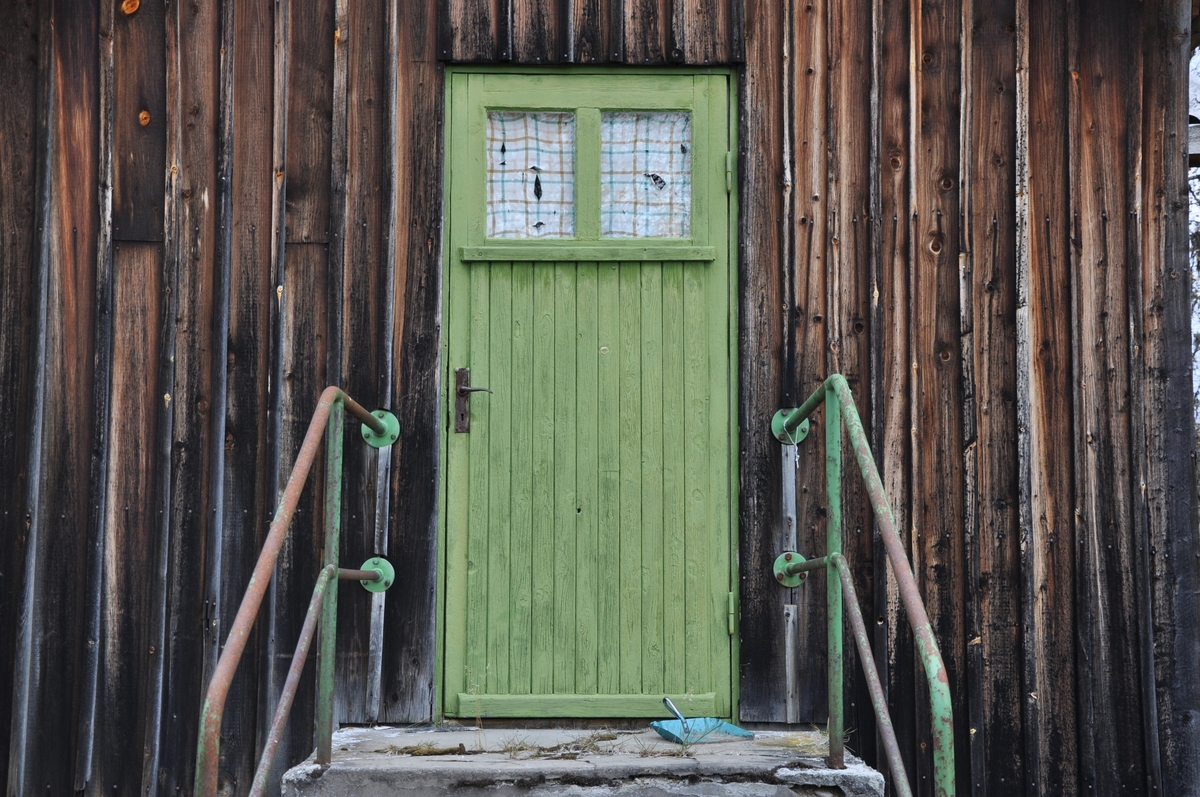 Entréparti med dörr och betongtrappa. Mjuka funktionalistiska stålräcken. Mot en fasad med solbränd locklistpanel. 1940-tal.