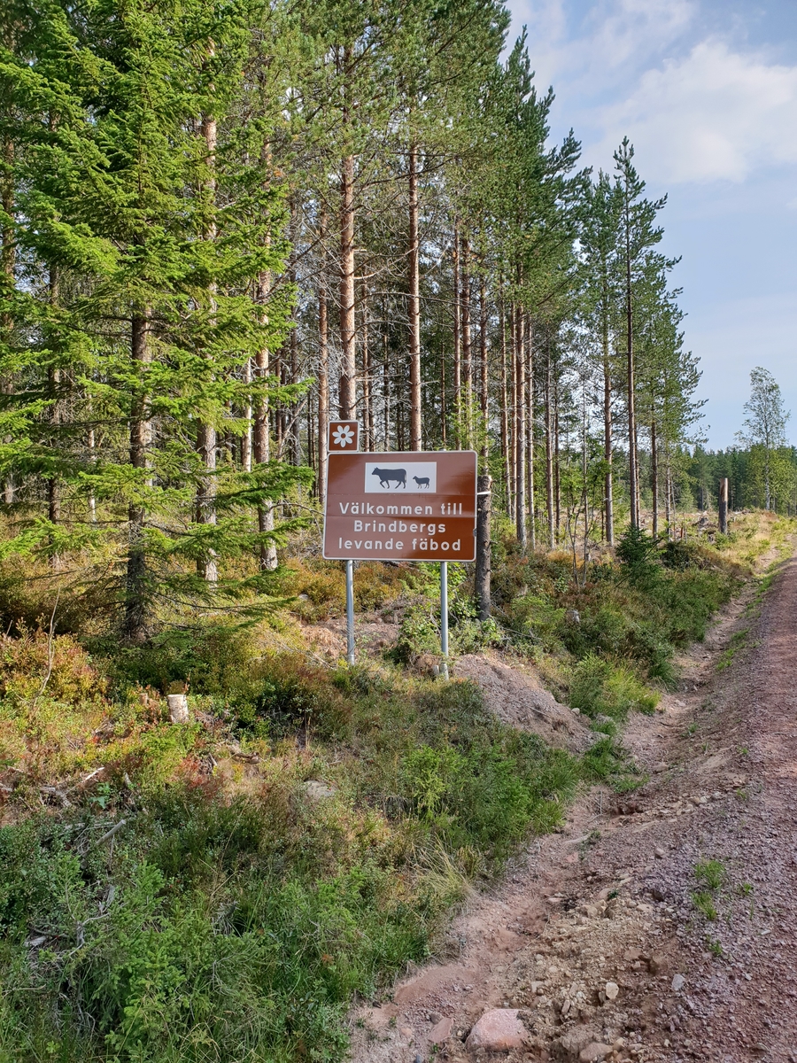 Välkommen till Brindbergs levande fäbod. Vägskylt på väg till Brindbergs fäbodar, Älvdalen, 2018.