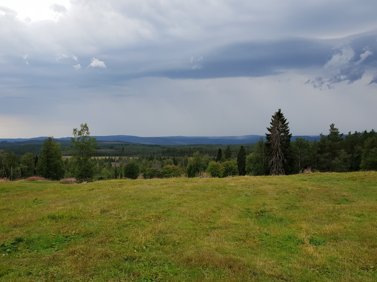 Vy från Brindbergs fäbodar, Älvdalen, 2018. Vid horisonten Sälenfjällen.