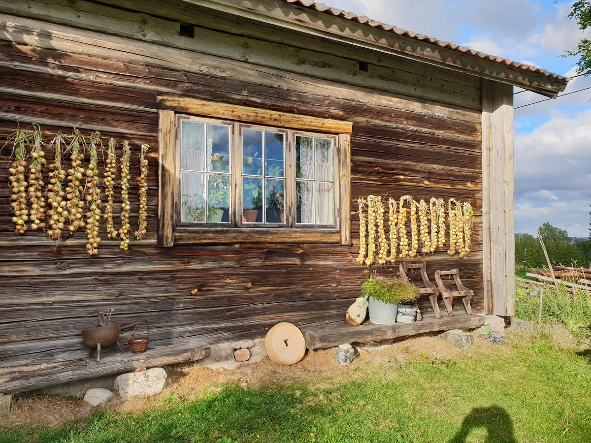 Bohus, Kättboåsen, Venjan, Mora, 2018. Lök hänger på tork.