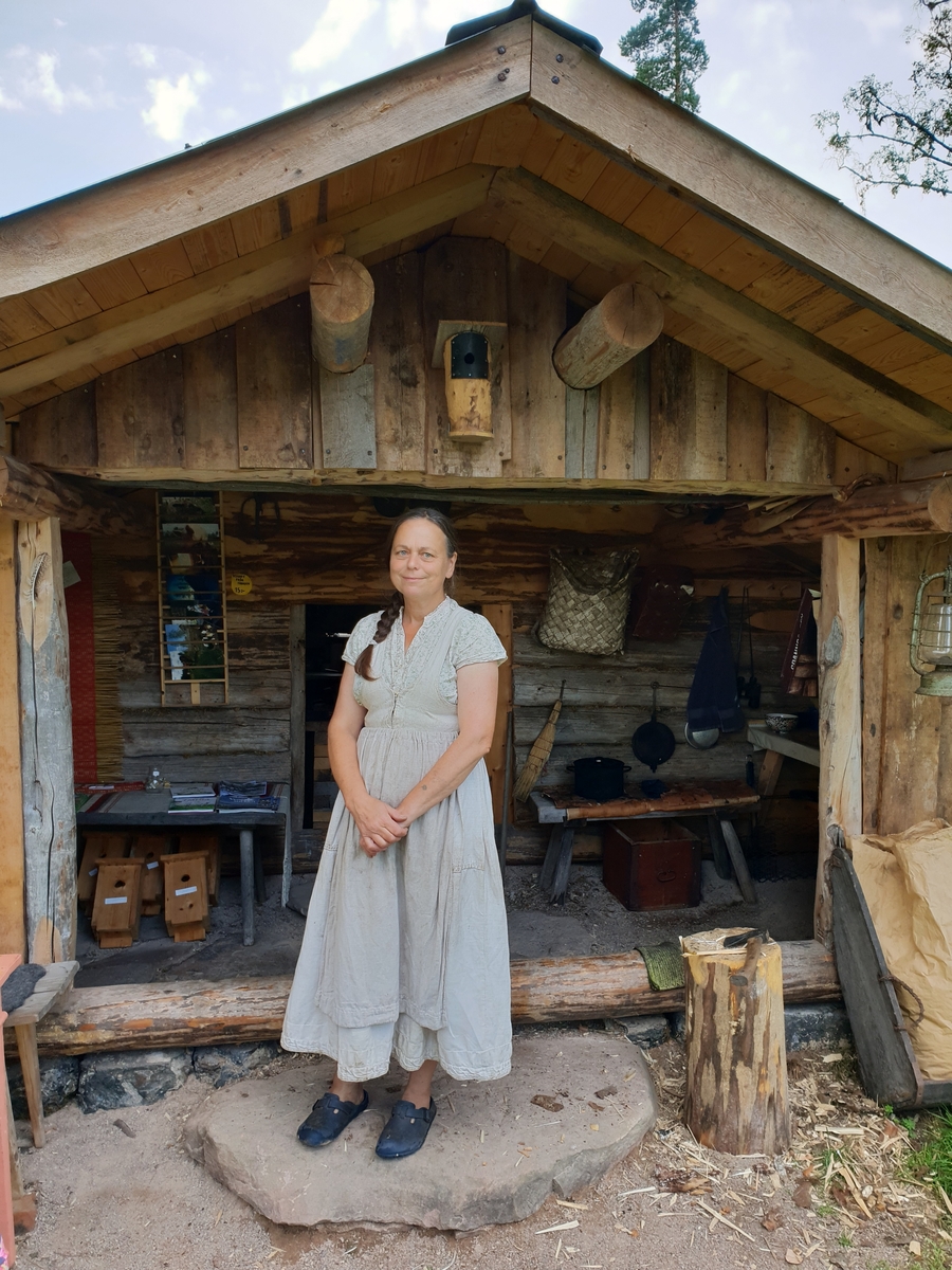 Yvonne Smedberg framför eldhuset, Kättboåsen, Venjan, Mora, 2018.