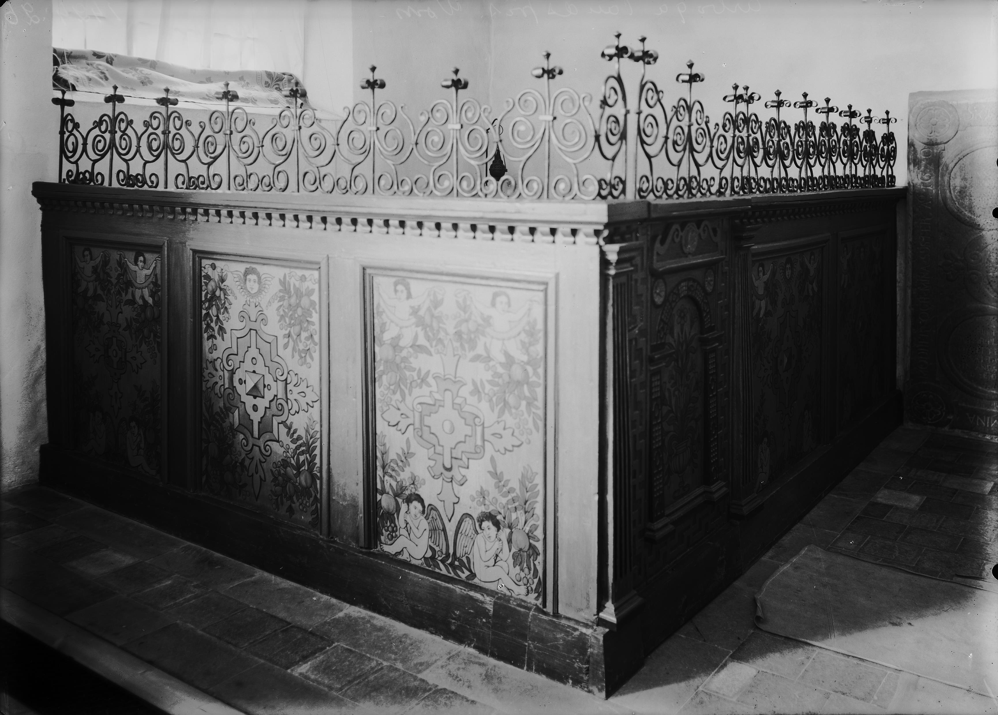 Korskrank (?). Flyttat. Det är smyckat med välbevarade renässansmotiv och upptill krönt med ett sirligt smidesverk.