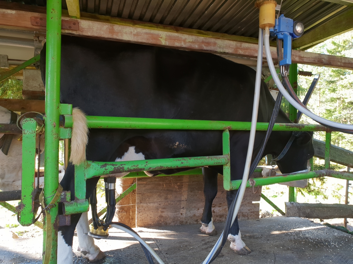 Korna mjölkas med mjölkmaskin, Nysjöns fäbodar, Svärdsjö, Falun, 2018.