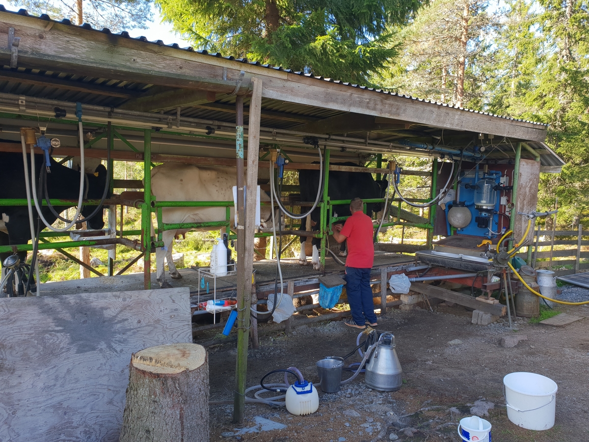 Hans-Olov Backlund övervakar mjölkmaskinen. Nysjöns fäbodar, Svärdsjö, 2018.