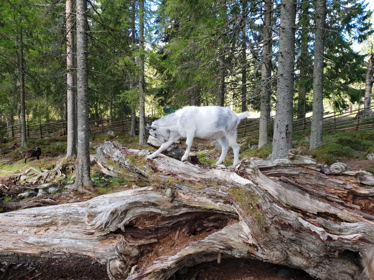 Killing kliar sig. Står på nedfallet träd.