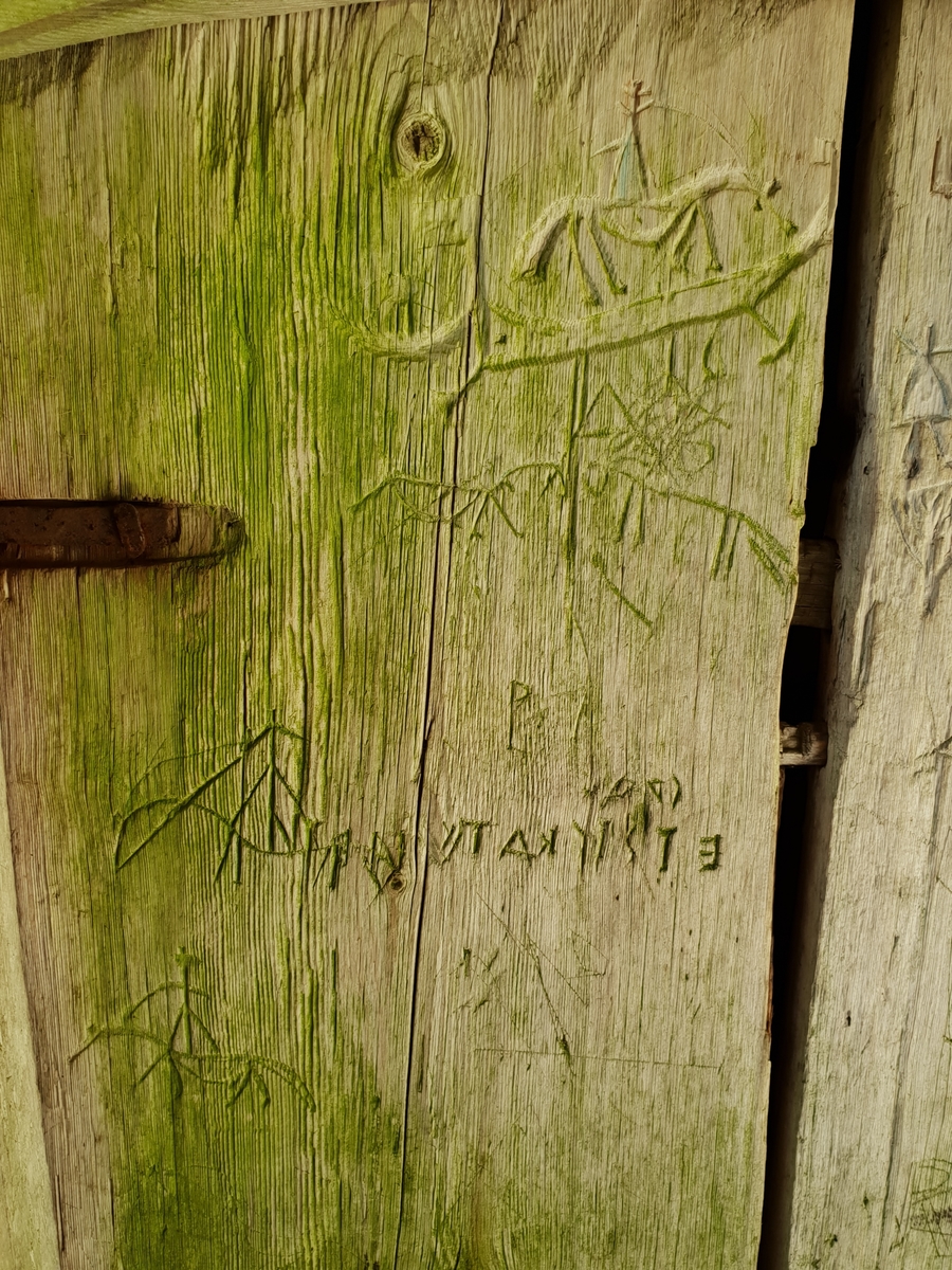 Dörr med ristningar, samiska motiv, renar, Aspgården, Skräddar-Djurberga, Orsa, 2018.