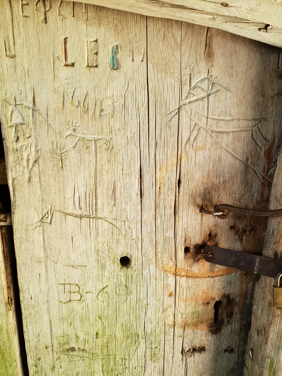 Dörr med ristningar, samiska motiv, renar, Aspgården, Skräddar-Djurberga, Orsa, 2018.