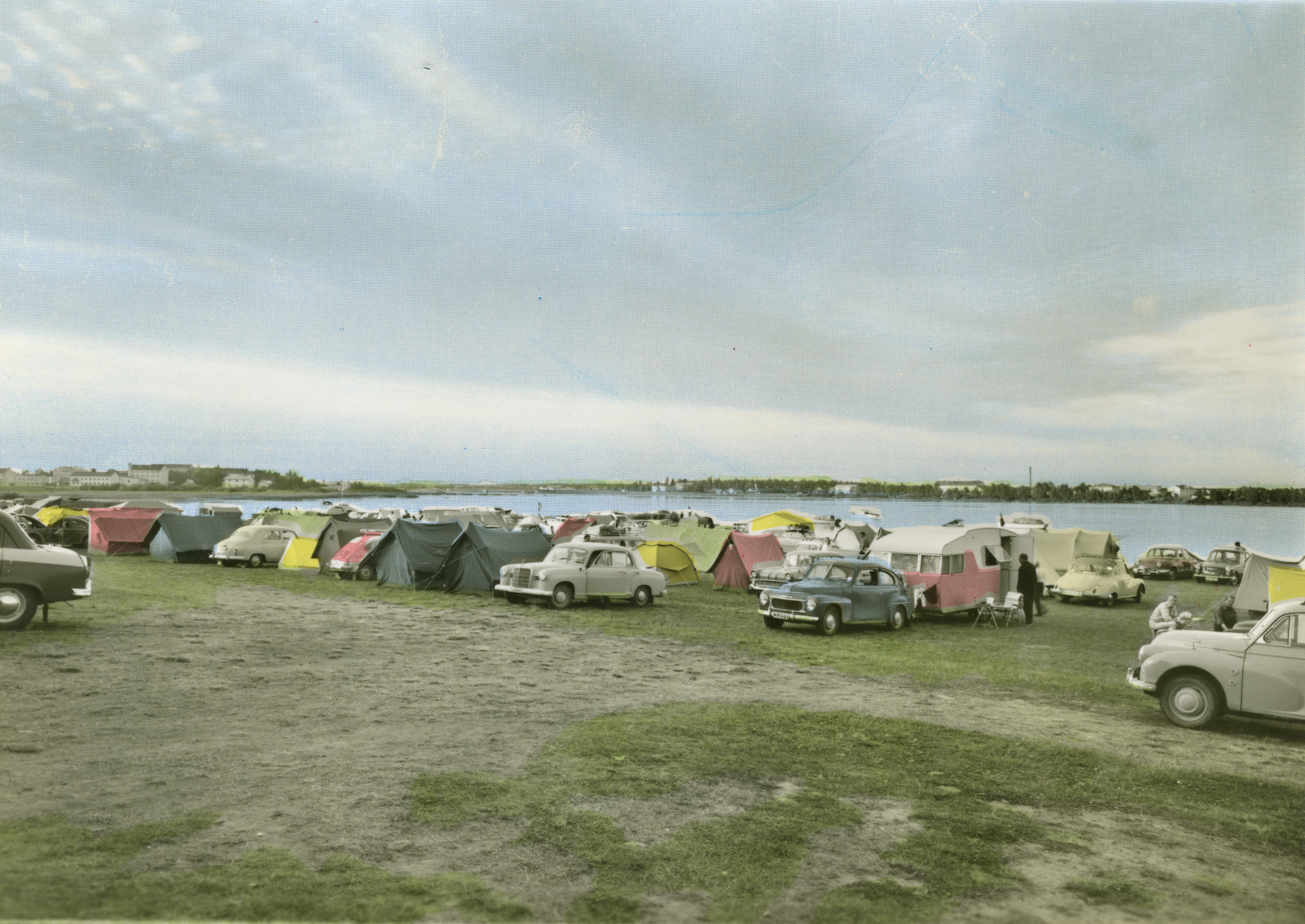 Sommarnatt vid campingplatsen, Torneå i bakgrunden. Handkolorerad variant av ac00955.