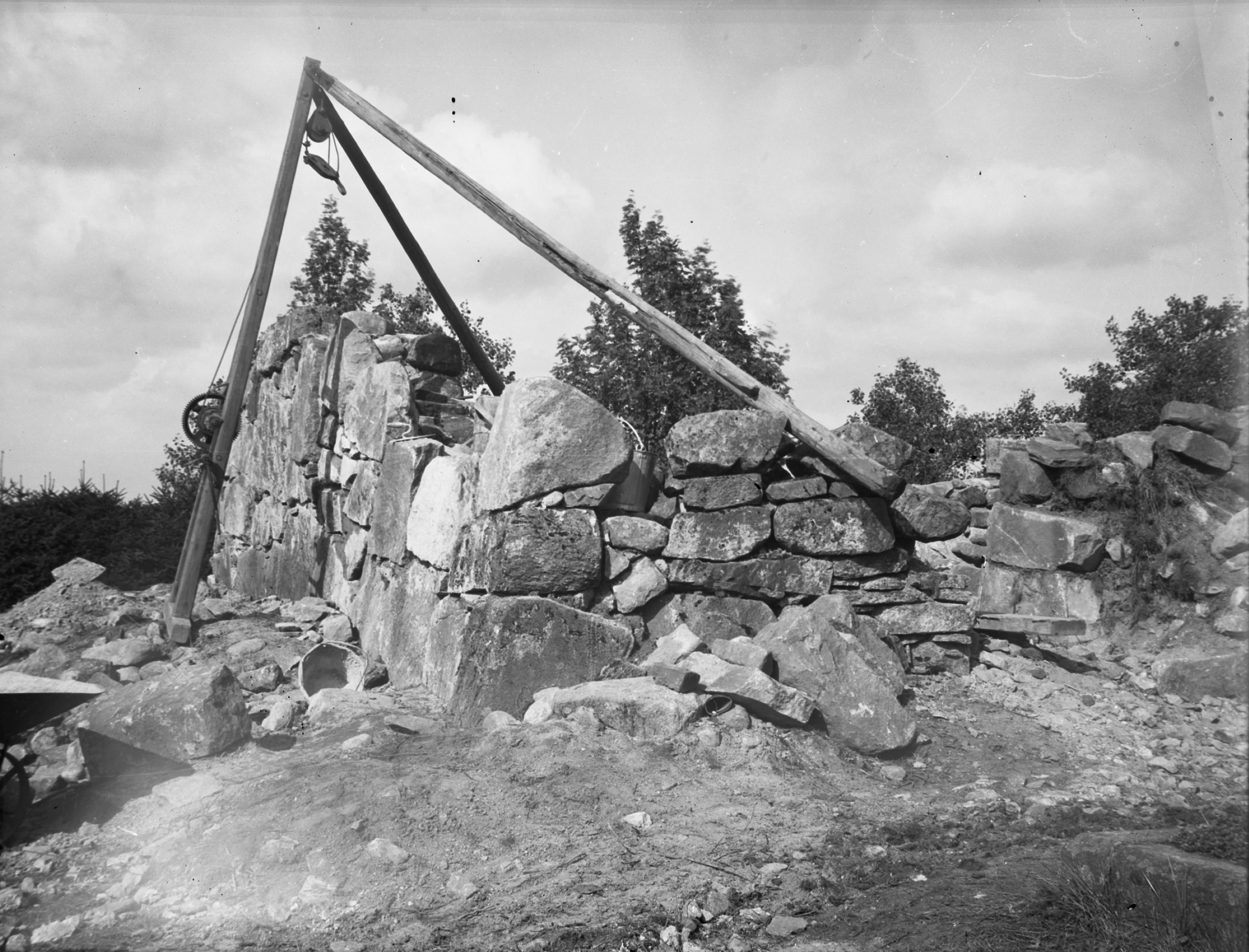 Långhusets sydvästra hörn. Under uppmurningsarbetet.