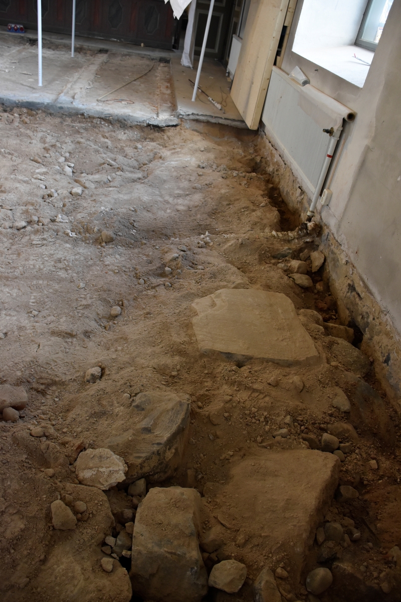 Bl.a. flat sten längs norra väggen. Från Ö.