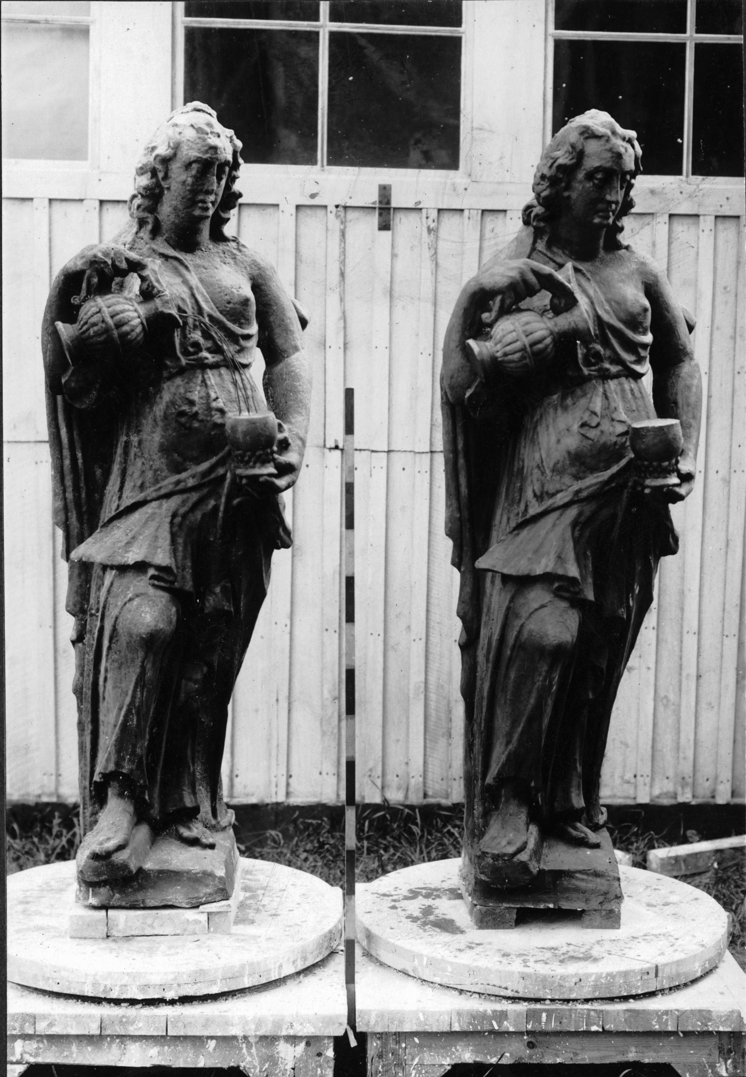 Skulptur föreställande Temperantia. Gipsavgjutninget och originalet.