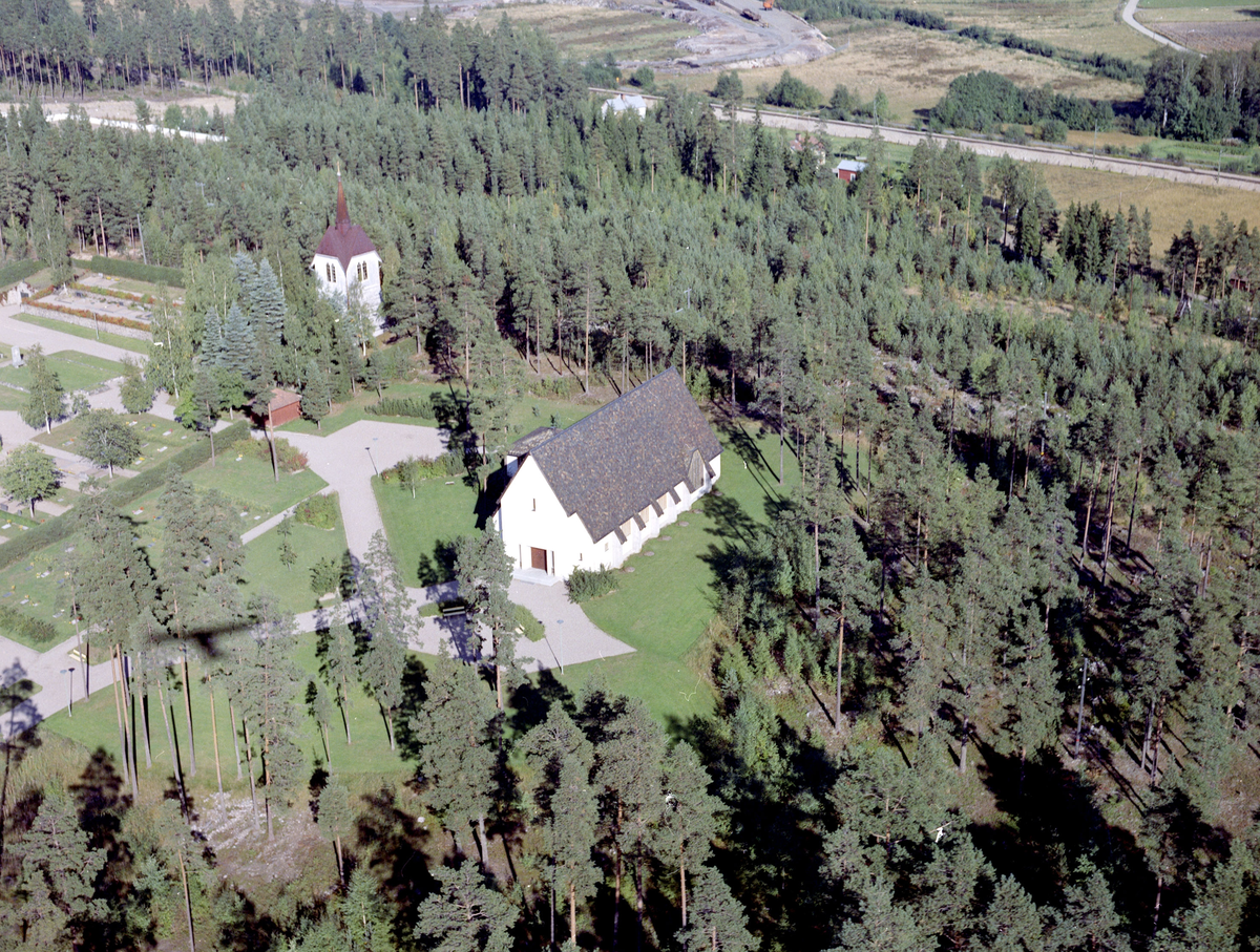 Flygfoto över Horndal, Avesta, och kyrkan 1967.