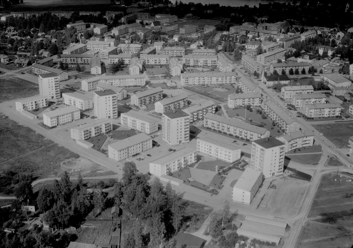 Flygfoto över Avesta 1962. Axel Johnsons väg och Myrgatan.