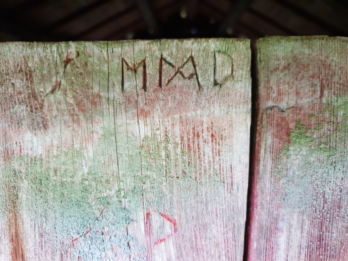 Ristning på trädörr med initialer, Jutbodarna, Grangärde, Ludvika, 2018.