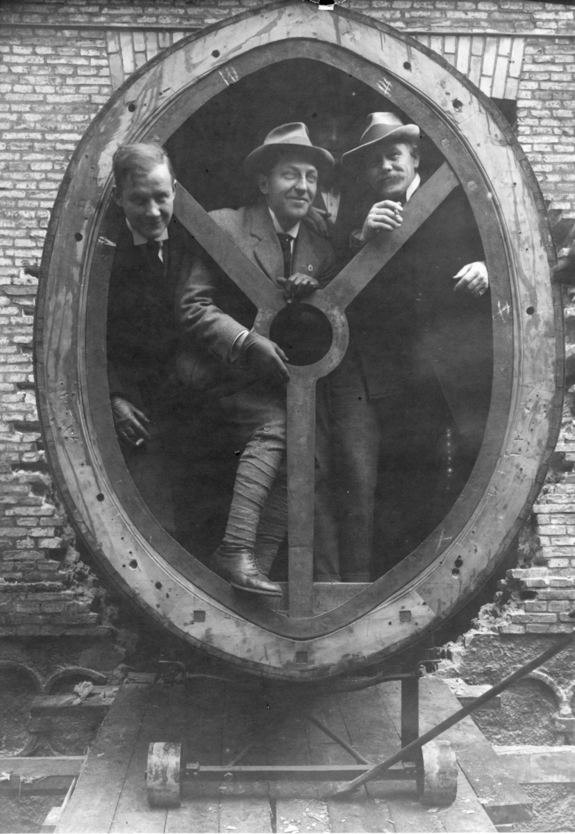 'Zoologiska avdelningens flytt: :: :: Enligt bildtext: ''I valfisken buk'', på gamla museigården. Malmska valen. 3 män står i segmentet, närbild. :: :: Bilden i artikel ''Malmska valens flyttning'' i Handels Tidningen (Göteborgs Handels och Sjöfartstidning) 1918-11-01.'
