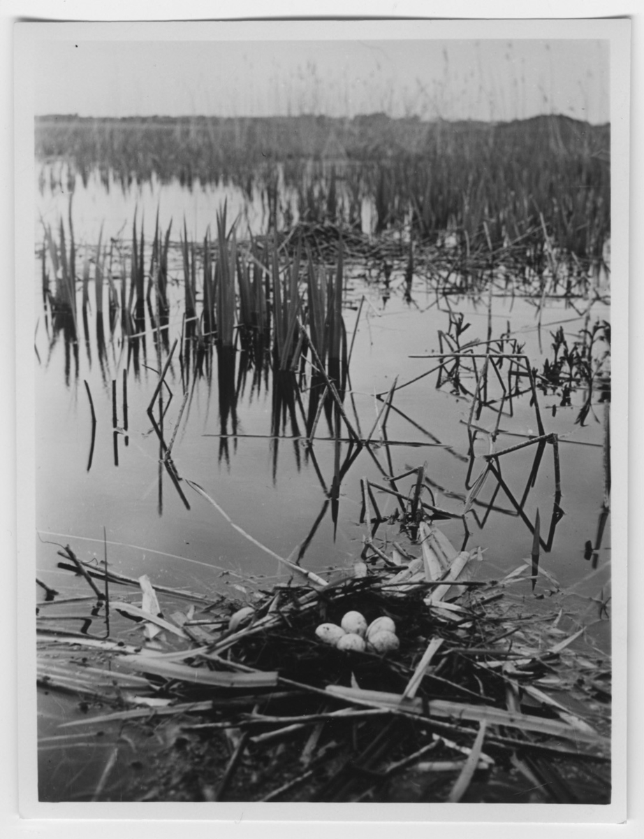 'Bo med 5 st ägg av svarthakedopping, på en vassrugge i sjön. Vy ut över sjön med vassvegetation. :: Text på baksidan: ''Ett vackert kärrdoppingbo avtäckt. Skrattmåsboet i bakgrunden förklarrar att ett så öppet liggande bo undgått påhälsning av kråkor. Kullen som här är fem ägg var i ett annat bo sex. Annars brukar doppingarna inte hålla sig med en så talrik barnskara som genomgående var fallet i år.'' :: :: Ingår i serie med fotonr. 2305-2346.'