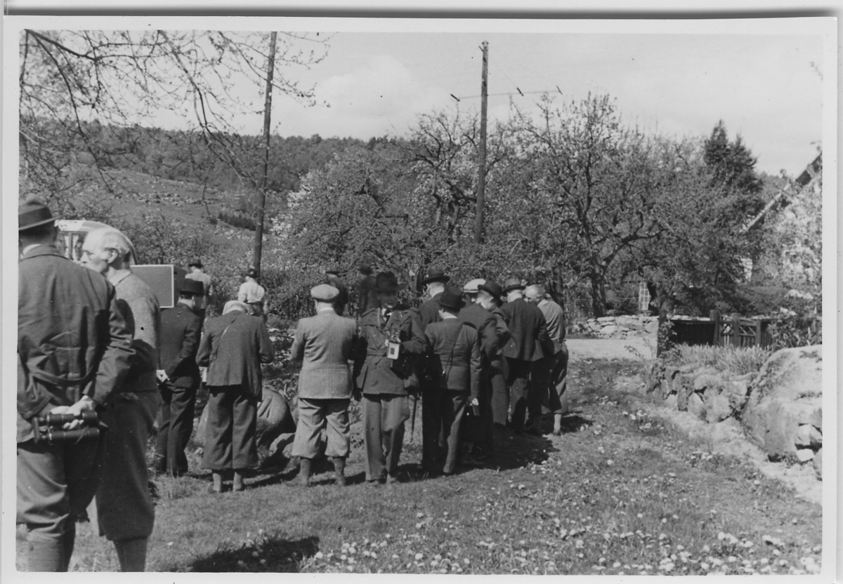 'Från Biologiska Föreningens utfärd till Ivö m. fl. platser i NÖ Skåne: :: :: Knappt 20 personer i Furustad vid slipstenarna, hattklädda. I bild även: stenmur, ledningar, byggnad och växtlighet, trädgård, stenmur, grind. Kikare. :: :: Se fotonr. 4119:1-11 och 4120:1-10 från samma utfärd. Fotonr.'
