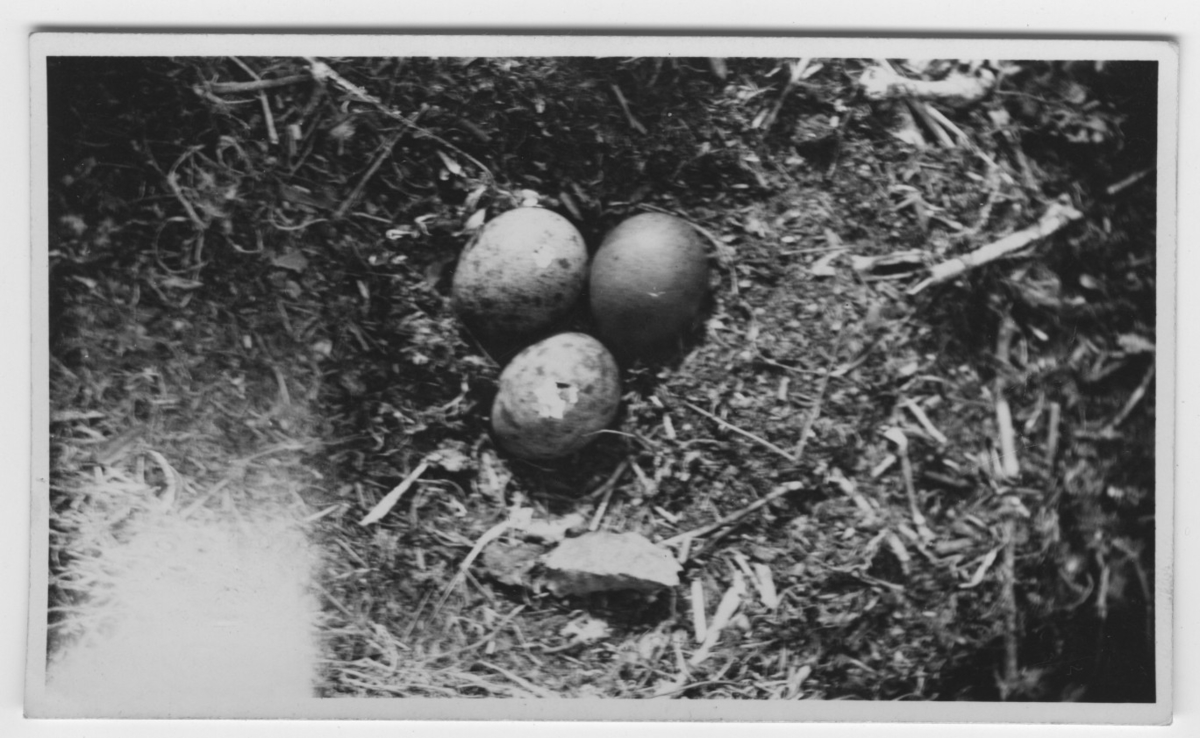 'Bo med 3 st ägg av pilgrimsfalk. :: :: Text på baksidan av fotot: ''3 st fullruvade ägg av pilgrimsfalken i en bergskreva vid Lygnern. :: :: Ingår i serie med fotonr. 4500:1-172.'