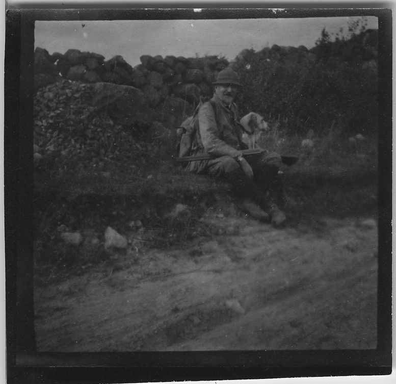 'Från Professor Leonard Axel Jägerskiölds ripjakter vid Fjällåsen. :: :: Man med, hund, ryggsäck och gevär sittandes framför en stenmur. Stengärdesgård. :: :: Ingår i serie med fotonr. 4312:1-38.'