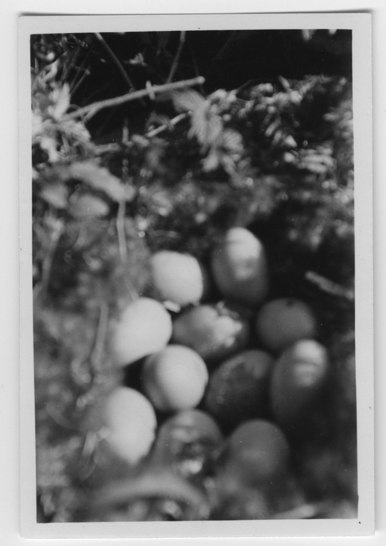 'Text enligt foto: ''Bo med 11 st nyvärpta ägg av svärtan högst uppe på norra Kalvön. Exkrementer syns på 2 st av äggen som honan gjorde vid uppflygningen. Hon har värpt det första ägget den 7 maj, således ungefär 1 och en halv månad tidigare än vanligt. Fotot är taget på 40 cm avstånd.'' :: :: Ingår i serie med fotonr. 4500:1-172.'