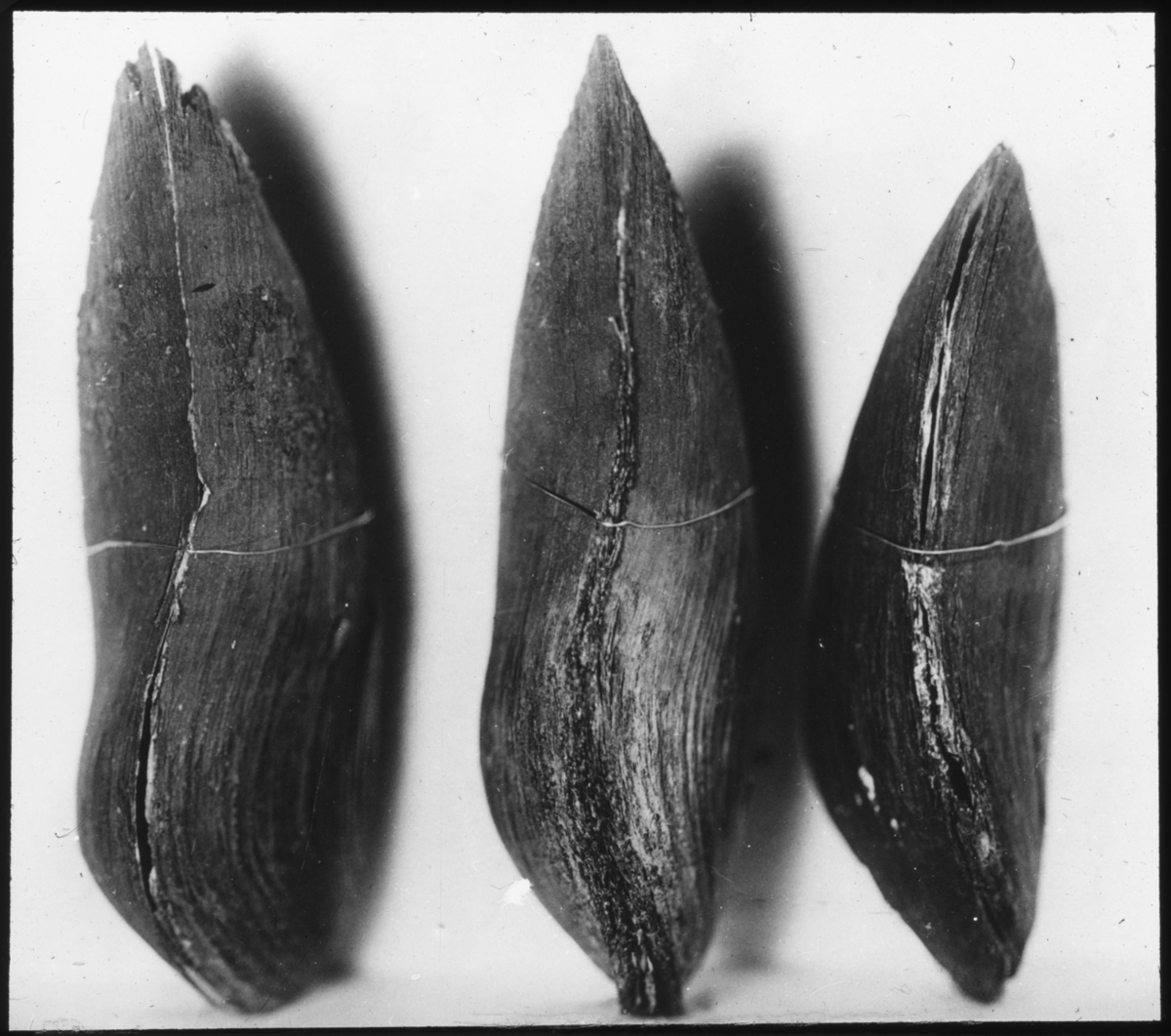 'Bildtext: ''Flodpärlmusslor med pärltecken.'' 3 st skal av pärlmussla, sedda från sidan. :: :: Ingår i serie med fotonr. 5119:1-8.'