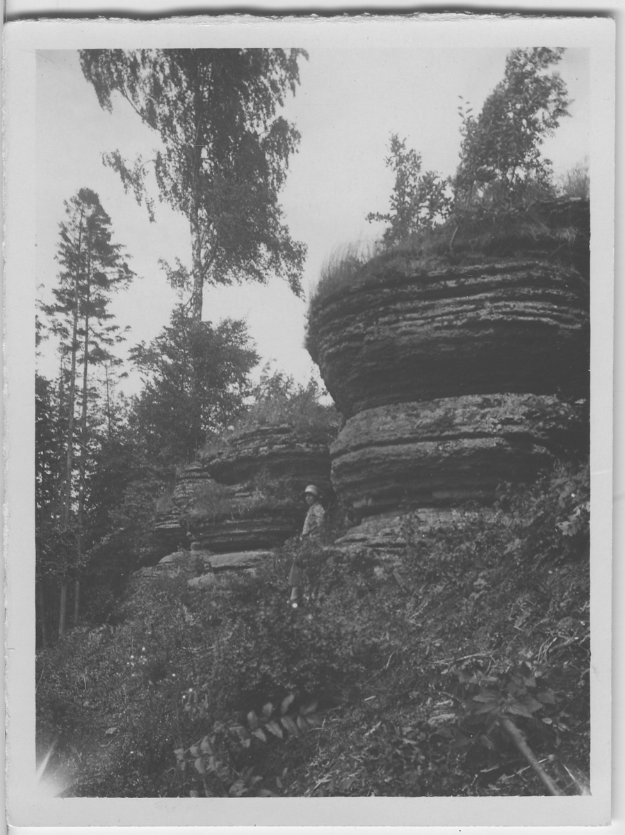 'Diverse foton från sannolikt Kinnekulle. Kalkbrott och naturliga skärningar. :: En kvinna vid foten av en vittrad klippa. :: Samma motiv som 4886, 4887, 4890 och 4891. :: :: Serie fotonr 4885-4901.'