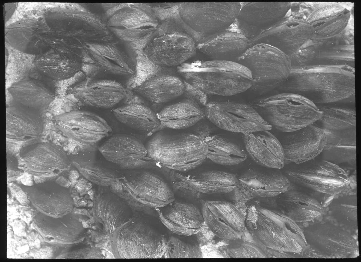 'Bildtext: ''Flodpärlmussor från Hälltorpsån fotograferade i Naturhistoriska museets bassäng.'' Musslor som sitter intill varandra i bassäng. :: :: Ingår i serie med fotonr. 5120:1-8, se även fotonr. 5119:1-8.'