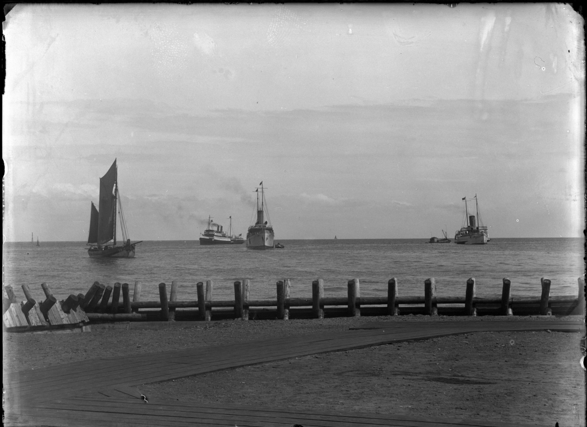 'Vy ut mot havet med 4 stora båtar. I förgrunden strand med träspångar och byggd förstärkningsvall mot havet. Se även fotonr. 5139:2 och 18 troligen från samma plats. :: :: :: Ingår i serie med fotonr. 5139:1-36. Fotonr. 5139:1-17 ligger i en ask med texten ''med motiv från (enligt pappasken) Helgoland. För diapositiv.'' Fotonr. 5139:18-27 ligger i en pappask med texten: ''Helgoland (''Augusta'')'' en del för diapositiv. Fotonr. 5139:28-36 ligger i en ask med texten ''Dubbletter från Helgoland. Dessutom diapositiv från Kristineberg och Lysekil.'''