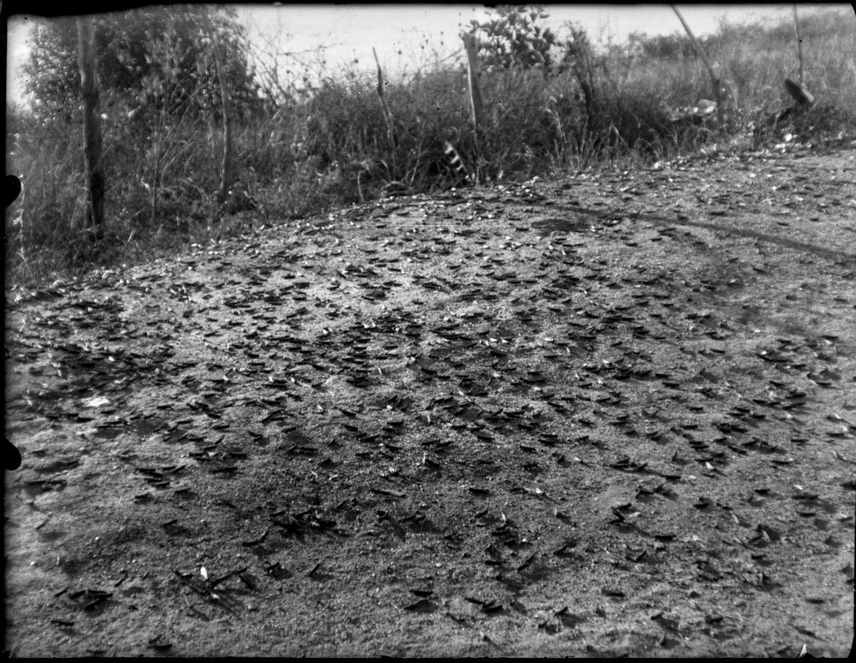 'Bildtext: ''En gräshoppssvärm slog ned utanför vårt hus.'' Kal markyta täckt av gräshoppor. I bakgrunden hög gräsvegetation. :: :: Ingår i serie med fotonr. 5125:1-2.'