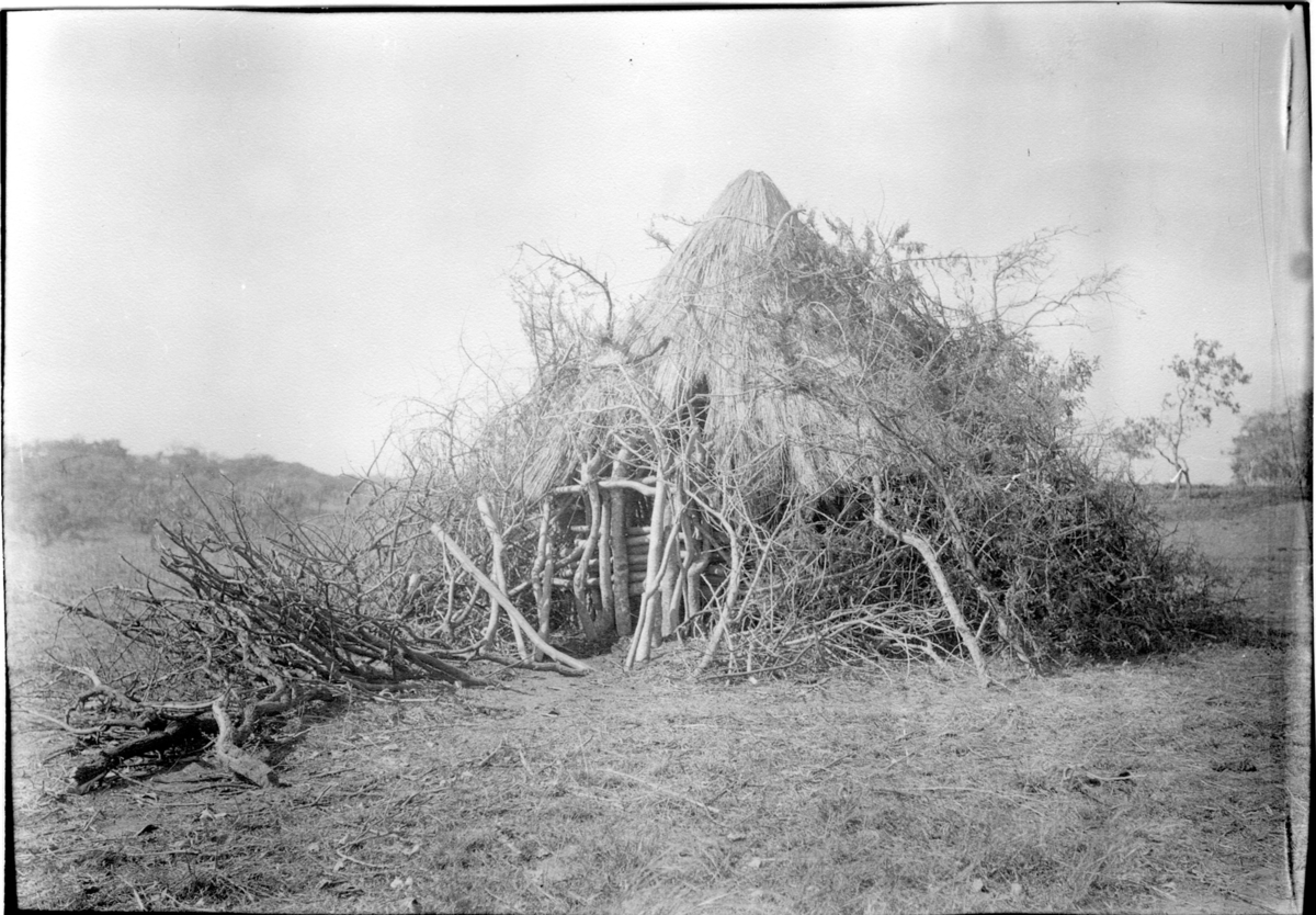 'Diverse fotografier från bl.a. dåvarande Nordrhodesia, nu Zambia, tagna av Konsul Magnus Leijer. :: :: Toppig hydda delvis täckt av diverse trädgrenar, öppningen avtäckt.'