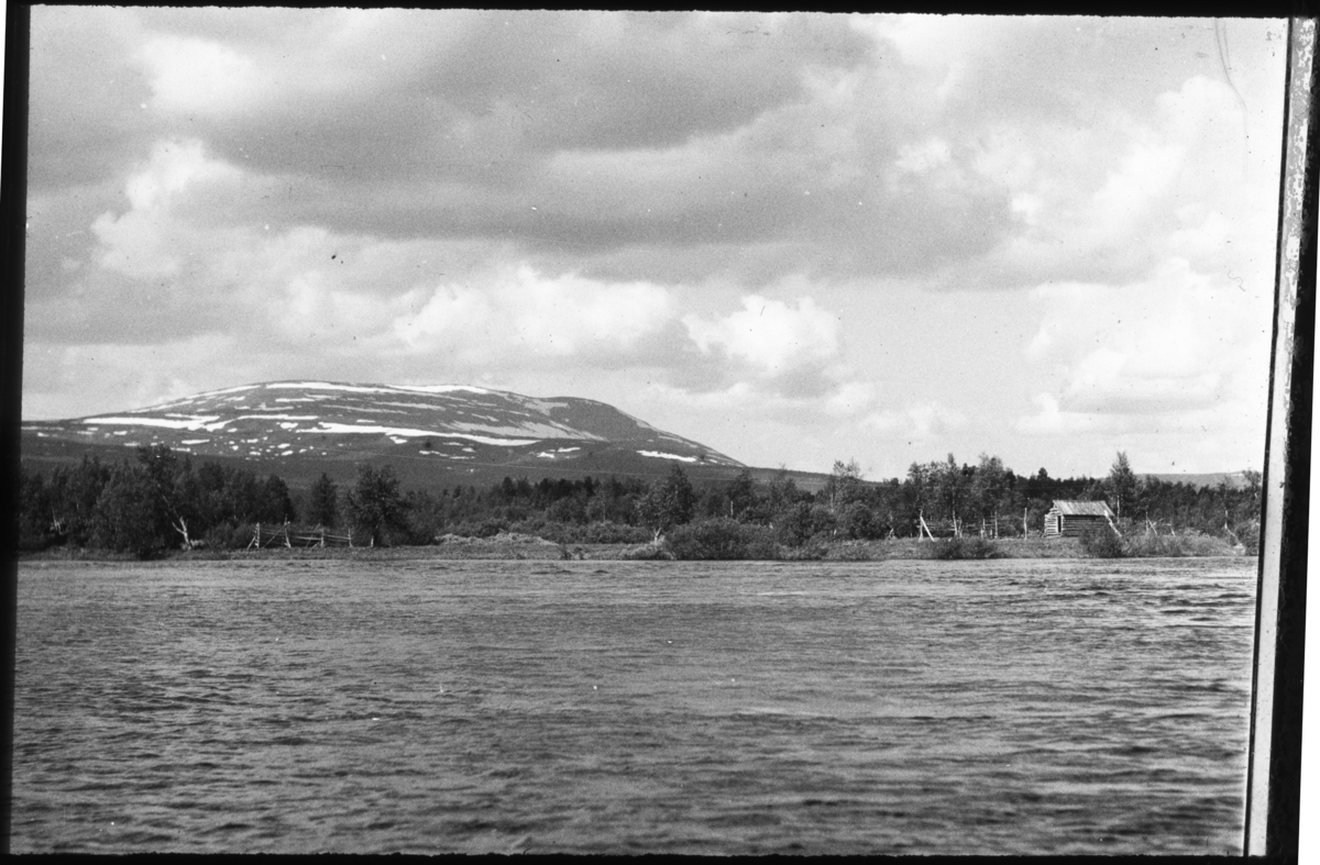 'Bildtext: ''Svaipa, sett från Laisälven öster om Fjället.'' Vy med liten timmerstuga, byggnad och träkonstruktioner ev. torkställningar. Snöklätt fjäll i fonden och gran- och lövvegetation :: :: Ingår i serie med fotonr. 5163:1-7 numrerade med bildnr 201-207.'