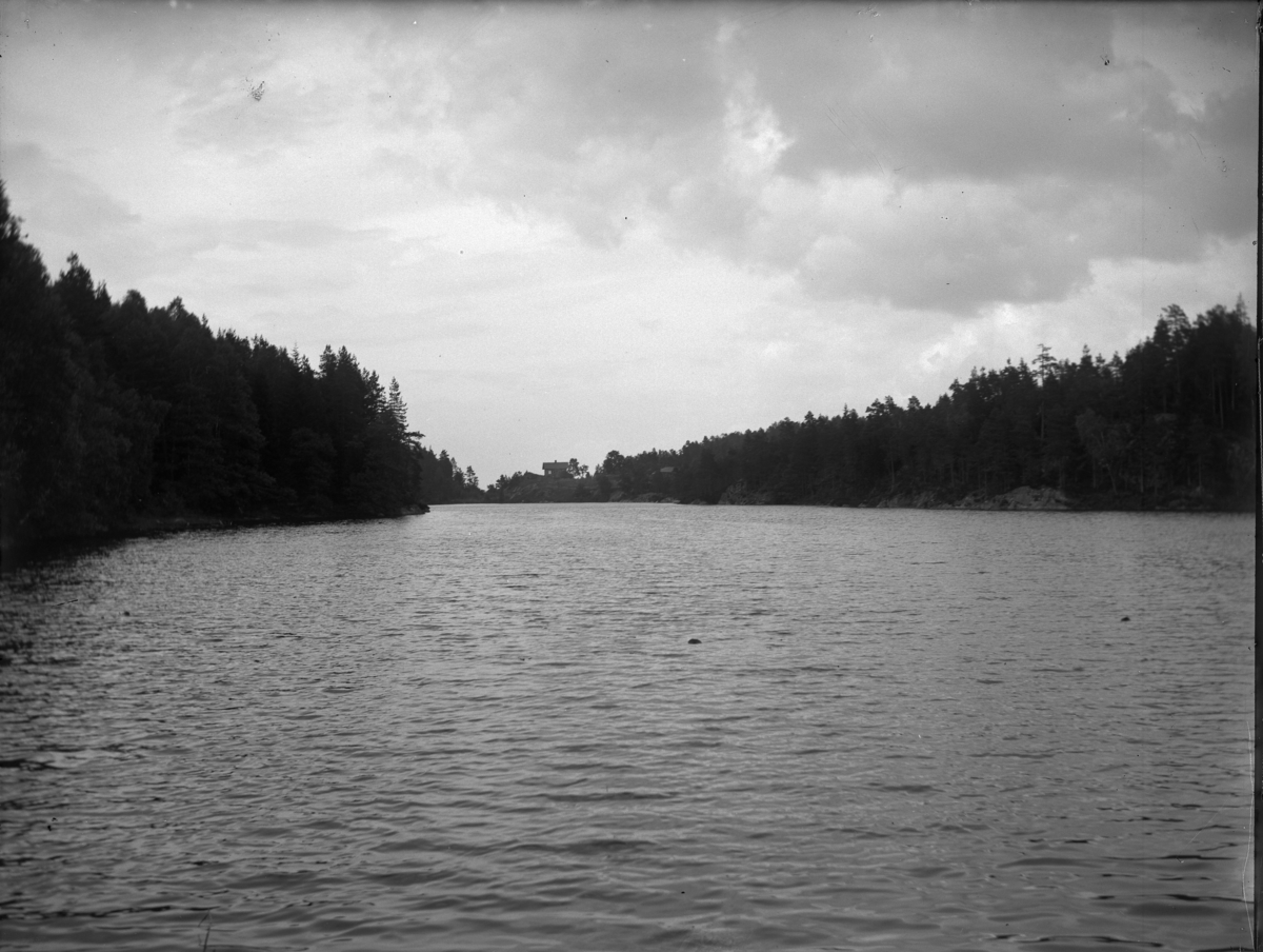 'Vy över sjö med granskog på sidorna. I fonden hus på berg. :: På asken som plåtarna ligger i står det att det ska finnas bilder från, Timmertjärnet, Trolldalen, Vid Bålnäs och Sågtjärnet. Dessa bildtexter hör till fotonr. 5229:8-13. Vilken som är vilken oklart. :: :: Ingår i serie med fotonr. 5229:1-13.'