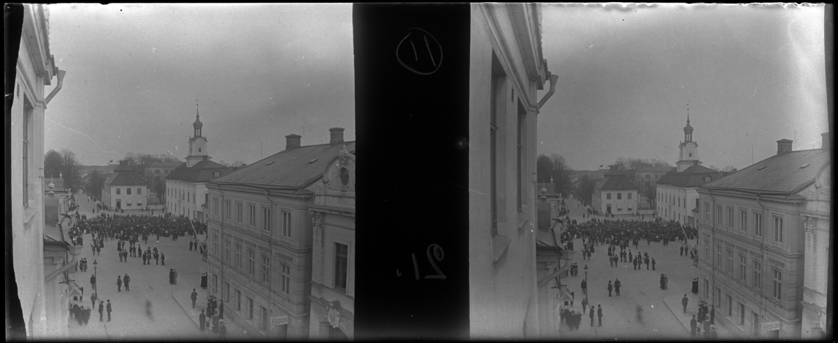 'Bildtext: ''Första maj.'' 1:a maj :: Gatuvy med hus och byggnader, gata med promenerande människor. På ev. torg, framför kyrka en stor folksamling. Längs gatan skyltar med text ''Manufaktur''. Affärer. Kläder. Ev. folkdräkt. Telefonkiosk. Gatlykta. :: :: Ingår i serie med fotonr. 5257:1-18, se även hela serien med fotonr. 5237-5267.'