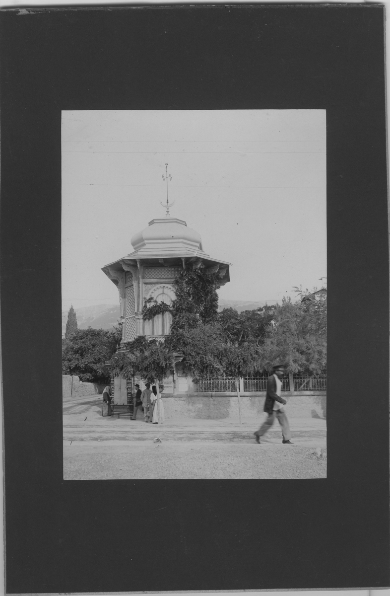 'Vy med tornbyggnad med vindflöjel i toppen, framför står män och kvinnor i en grupp. :: :: Se serie med fotonr. 5273:1-17. Serie fotonr 5269-5292, Stuxbergs resa till Kaukasien, 1897.'