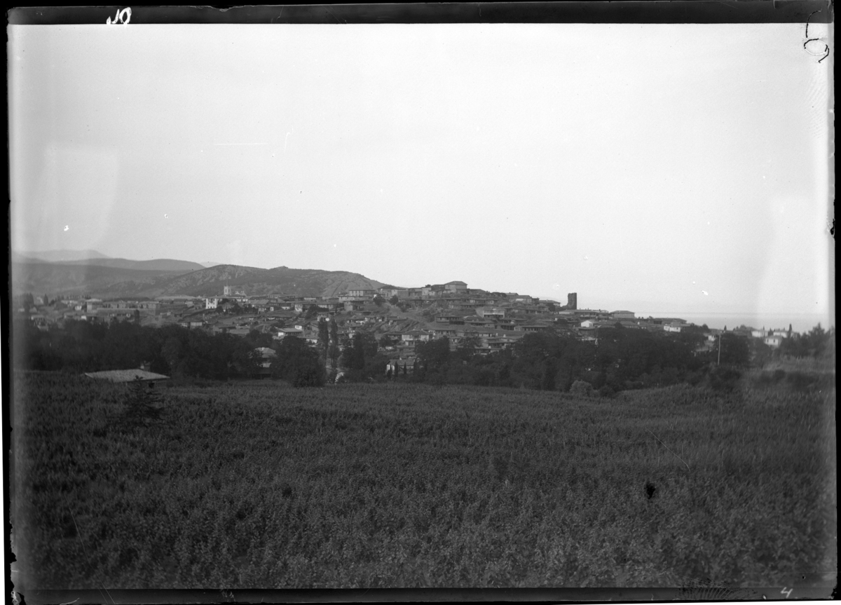 'Vy med öppet fält, ev. vinodling, i förgrunden och vy mot bebyggelse, stad med berg i fonden. :: :: Ingår i serie med fotonr. 5287:1-22. Se även fotonr. 5269-5292 med bilder från Stuxbergs resa till Kaukasien.'