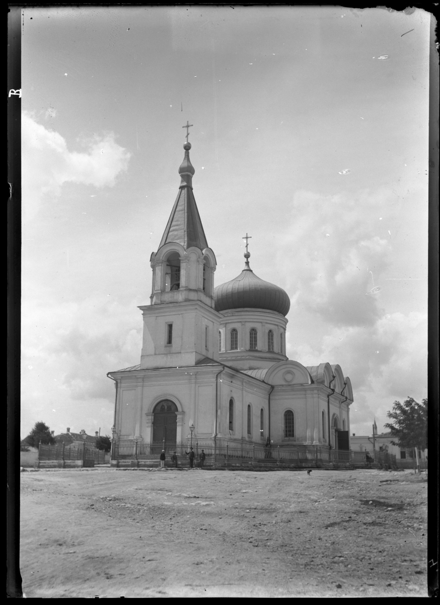 'Vy med kyrka där en grupp, 4 personer, står framför. :: :: Ingår i serie med fotonr. 5283:1-19. Se även fotonr. 5269-5292 med bilder från Stuxbergs resa till Kaukasien.'