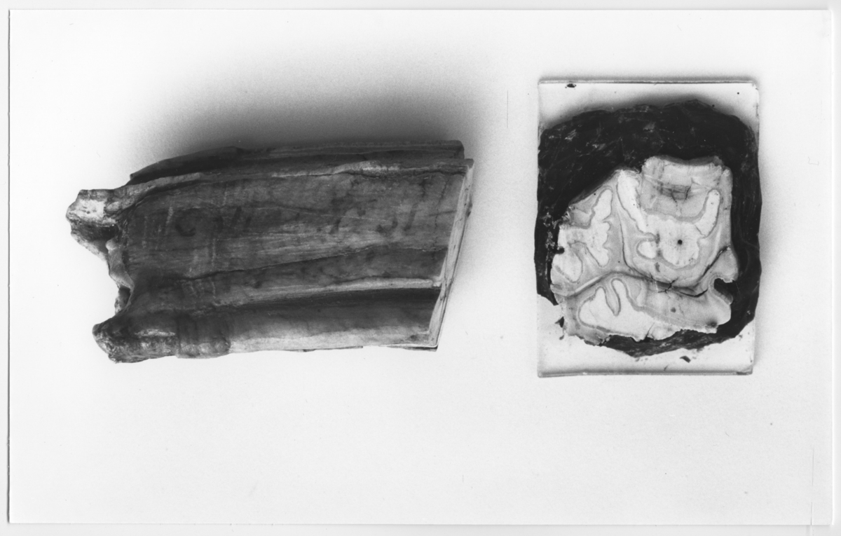 Titel: 'Närbilder på tand, snitt samt sedd från sidan. Tand, 2:a eller 1:a molaren i höger överkäke. :: :: Ingår i serie med fotonr. 5634:1-6.'