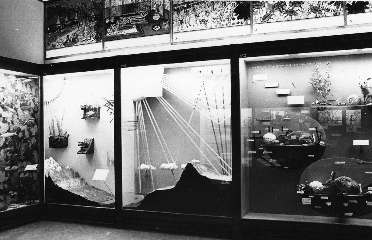 'Ekologiutställningen på Göteborgs Naturhistoriska museum. :: Överrubrik i monter: ''Materia flödar genom allt levande - oss också.'' :: :: Ingår i serie med fotonr. 5527:219-228. :: :: Ingår i serie med fotonr. 5527:217-229 med diverse utställningsbilder.'