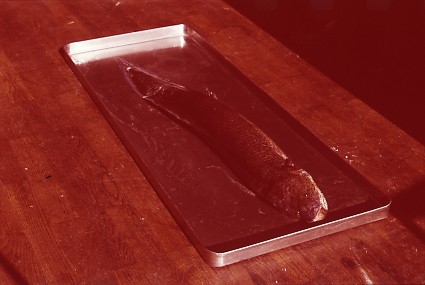 'Bilder en död lungfisk från akvariet. Avgjuten och placerad i basutställningen på Göteborgs Naturhistoriska museum, 1960. Avgjutningen gjord av Björn Wennerberg. :: :: Fotograferad på en bricka på ett bord. Ryggsidan synlig.'