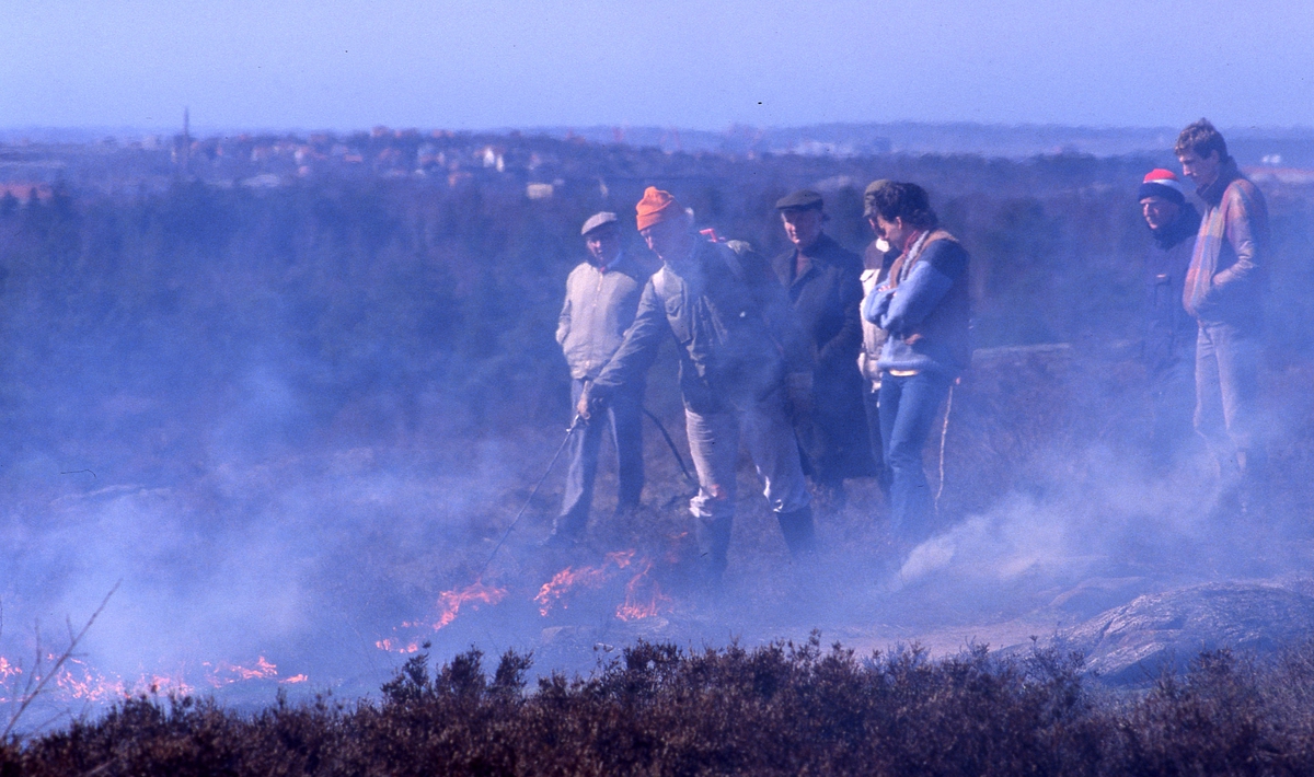 'Ljungbränning i Änggårdsbergen, Botaniska: :: :: Grupp människor, åskådare till när ljungen bränns ned. Vy med staden i bakgrunden. :: :: Ingår i serie med fotonr. 5955:1-5.'