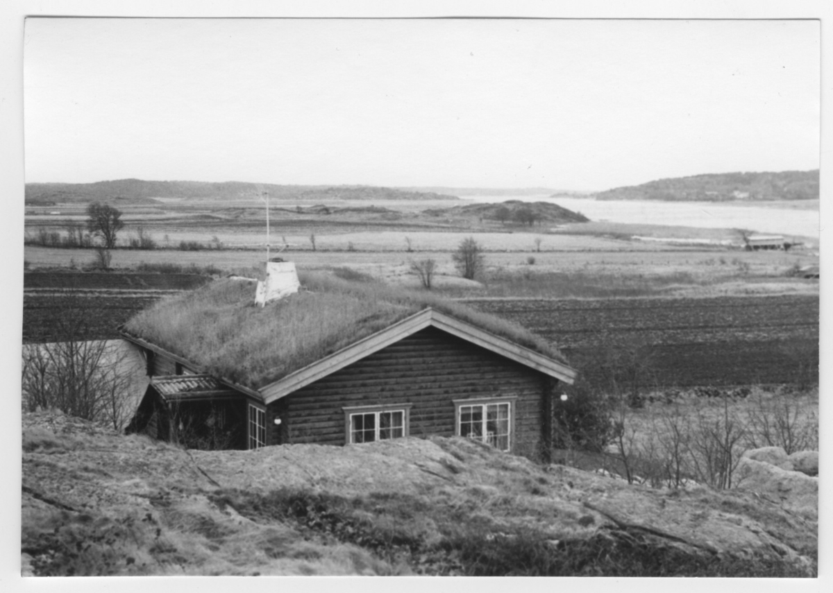 'Bildtext: ''Sedimentyta vid Nordre Älv. Riktning 292.'' I förgrunden timrad stuga, trähus med gräsbevuxet tak. Fönster, skorsten. Vy med öppna fält, åkrar och enstaka träd i fonden. :: :: Ingår i serie med fotonr. 6970:1-1125, dokumentation av Hisingens naturgeografi, visande landskapsformerna i stora drag och gjord inför exploateringen av området. Platserna för fotograferingen finns utsatta på karta i skala 1:4000 som finns på Göteborgs Naturhistoriska musem. Fotoriktningen mättes med kompass i gammalgrader.'