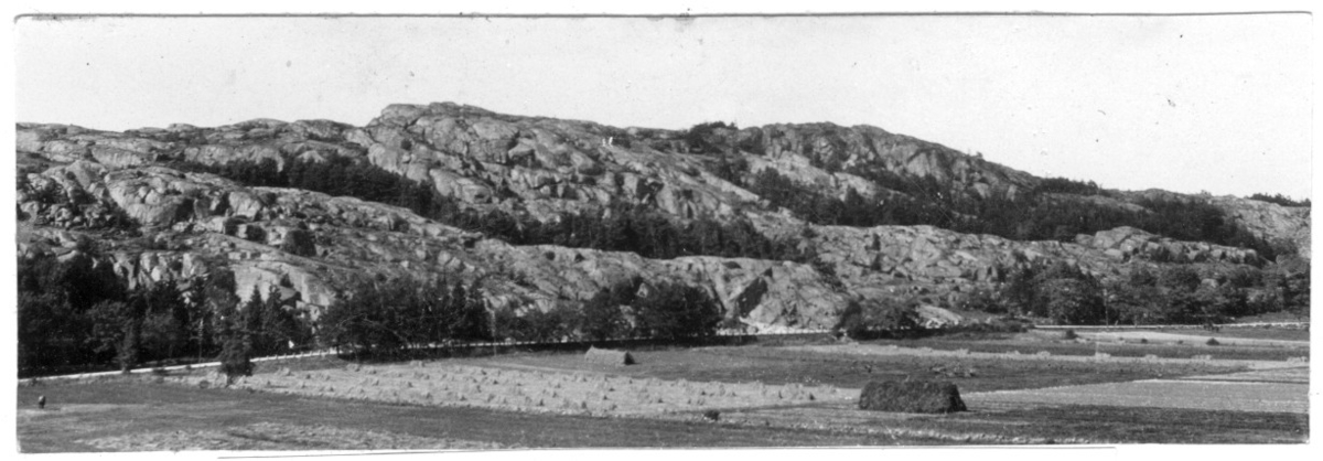 'Bildtext: ''Kulturskog söder om Häggvall.'' Vy med hässjor på öppen jordbruksmark nedanför kalt berg delvis trädbevuxna. :: :: Fotonr. 7046:1-84 indelade som ''Landskapsbilder från Göteborgs- och Bohus län.'' Ingår i serie med fotonr. 7046:1-383, 7047:1-33 och 7048:1-67 med bilder från Länsjägmästare John Lindners bildarkiv.'