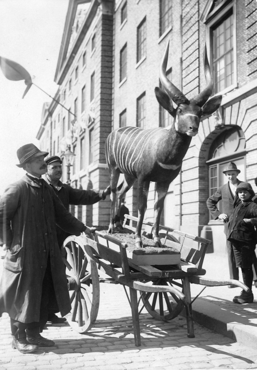 'Zoologiska avdelningens flytt till Naturhistoriska Museet i Slottsskogen: Bongon stående på flyttningskärran, på gata utanför byggnad. 2 män och barn stående bredvid. :: :: Montaget står utställt på Göteborgs Naturhistoriska Museum i däggdjurssalen monterskåp nr. 54. (2007-10-10) :: :: Se även fotonr. 5345:29.'