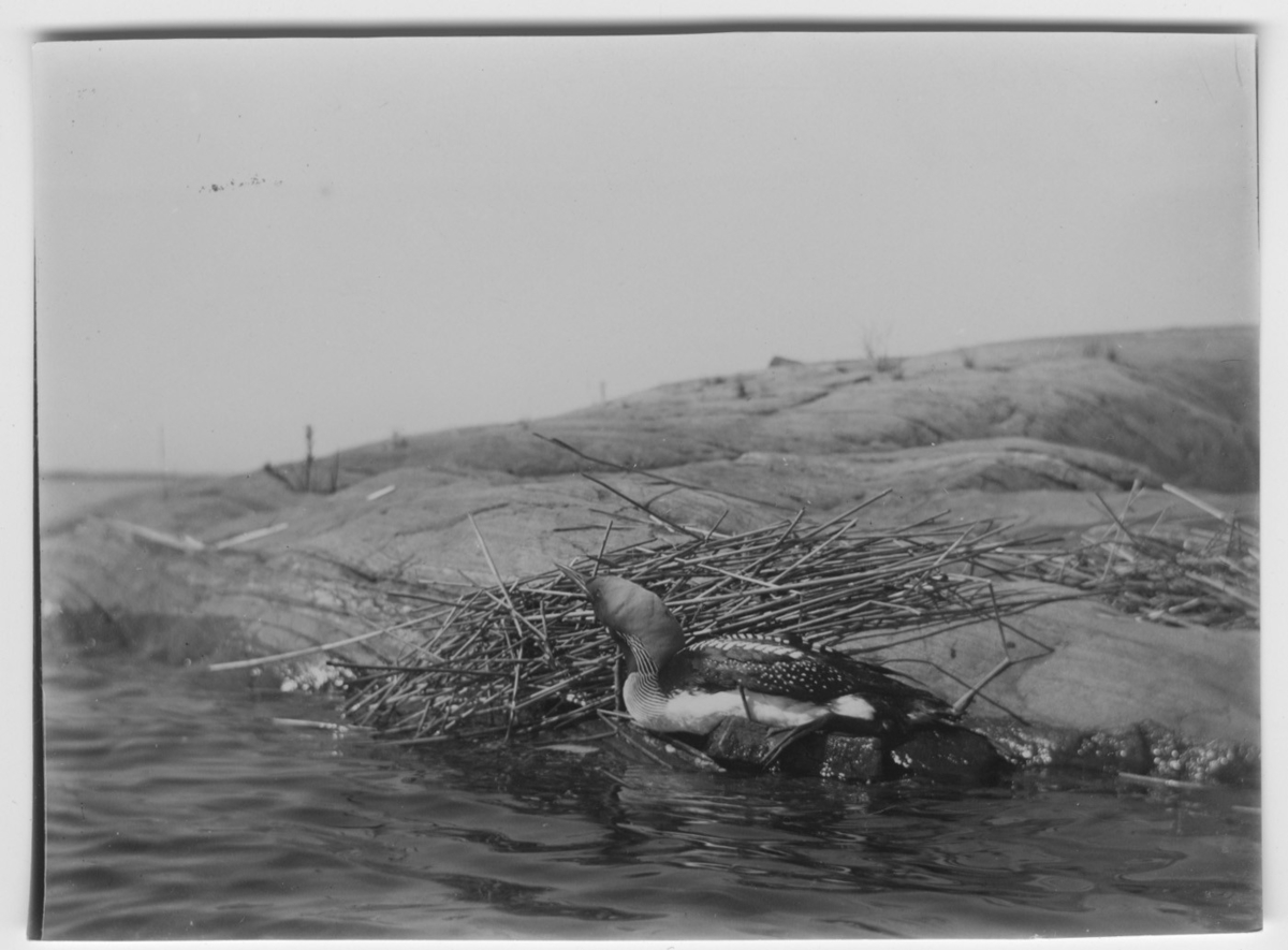 'Storlom, hanen vid sitt bo på berghäll i vattnet. :: :: Ingår i serie med fotonr. 817-841.'