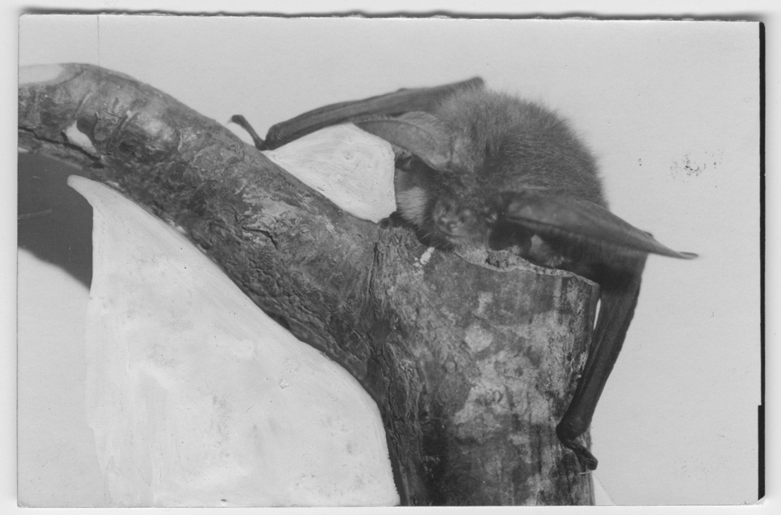 'Långörad fladdermus, hane, klättrande, sedd framifrån. Närbild. :: :: Ingår i serie med fotonr. 1851-1861.'