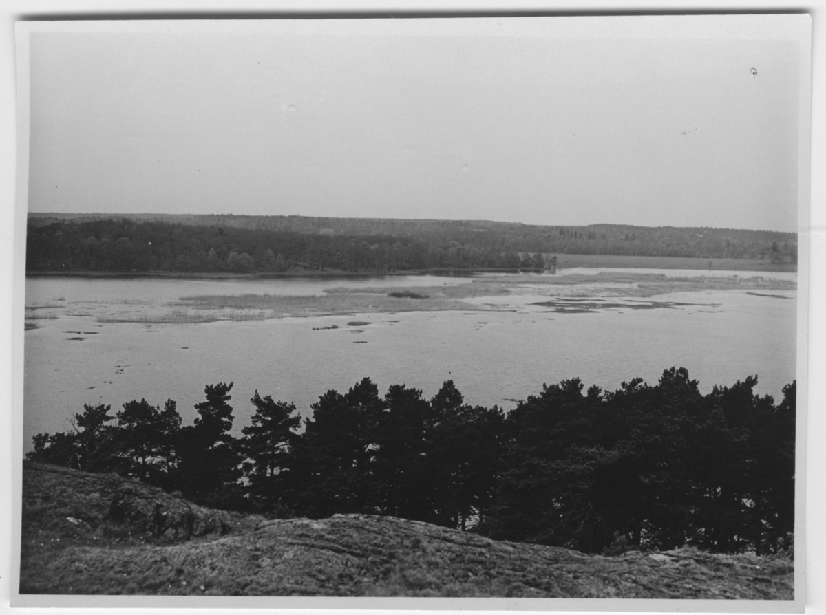 'Utsikt från Kvarnberget över vassarna utanför lunden i sydväst. I förgrunden tall på berghäll. :: Text på baksidan:''Utsikt från Kvarnberget över vassarna utanför lunden i sydväst.'' :: :: Ingår i serie med fotonr. 2305-2346.'
