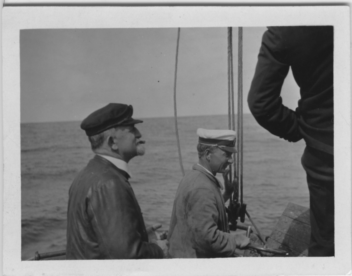 'Från Biologiska Föreningens utfärd till Hallands Väderö: :: 2 män på däck, iklädda mössa. En tredje persons arm synlig. :: :: Se fotonr. 1464 och 4311:1-58 från samma utfärd.'